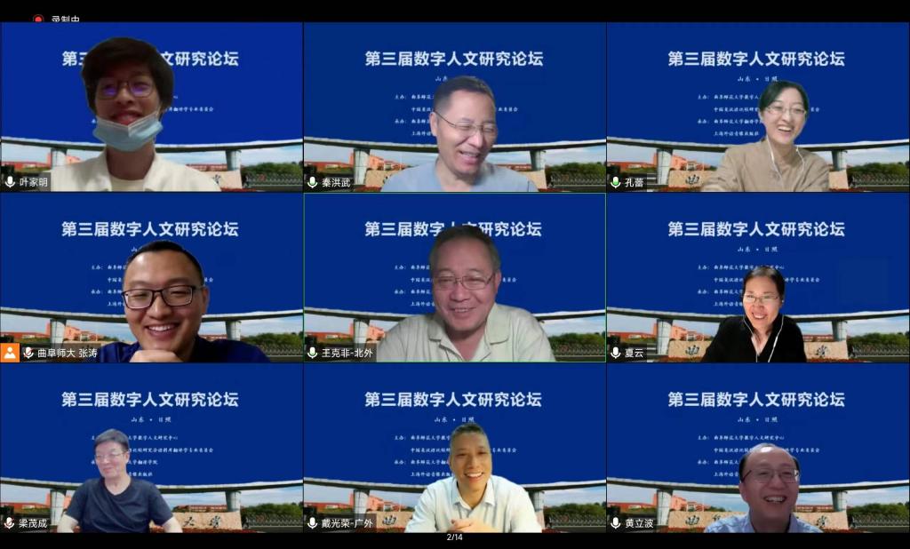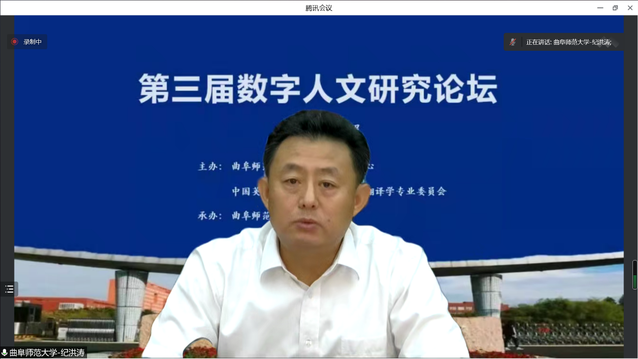 曲阜师大新闻中心讯(通讯员:张涛) 日前,第三届数字人文研究论坛在D体育在线登录官网举办。本次论坛由曲阜师大数字人文研究中心与中国英汉语比较研究会语料库翻译学专业委员会联合主办,曲阜师大翻译学院与上海外语音像出版社承办。来自北京外国语大学、上海外国语大学、台湾辅仁大学、北京航空航天大学、上海交通大学、北京师范大学等数十所高校的数字人文研究专家齐聚云端,共同分享数字人文研究的新成果、新进展。D体育在线登录官网党委常委、副校长纪洪涛出席论坛开幕式并致辞。开幕式由曲阜师大翻译学院院长夏云教授主持。
