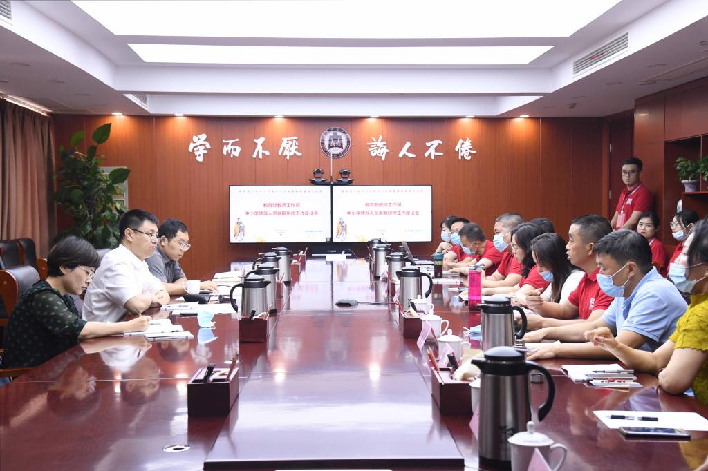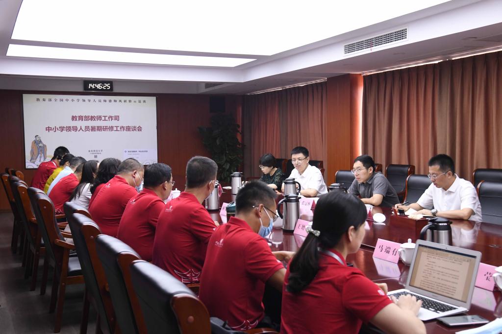 曲阜师大新闻中心讯(通讯员:徐秀 摄影:董少伟)8月16日,教育部教师工作司在D体育在线登录官网召开座谈会,听取对于中小学校领导人员暑期研修及《中小学校领导人员管理暂行办法》落实情况的意见建议,了解中小学教师参与国家智慧教育平台“暑期教师研修”专题学习的情况。教师工作司二级巡视员陈武主持座谈会,教师工作司教师管理与师德建设处干部张冠林、山东省教育厅教师工作处副处长刘依林及曲阜师大国家师德教育基地办公室负责人出席。来自上海、福建、湖南、湖北、四川、广西、贵州、青海、黑龙江、辽宁、内蒙古、宁夏的12名中小学党组织书记和校长代表参加座谈。