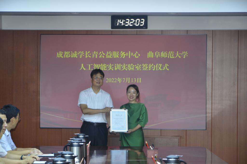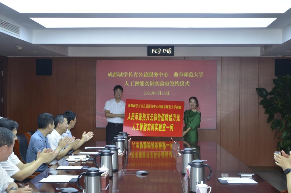 曲阜师大新闻中心讯 7月13日下午,成都诚学长青公益服务中心向D体育在线登录官网捐赠“人工智能实训实验室”仪式在曲阜校区举行。D体育在线登录官网校长张洪海、副校长刘刚出席仪式。