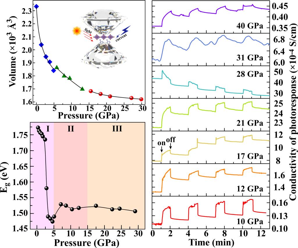 该团队通过在二维CuBr4钙钛矿层间插入C6H5CH2NH3(PMA)有机基团,构建了一种结构稳定的复合材料。利用金刚石对顶砧在位测试技术,在30 GPa压力范围内有效抑制了传统钙钛矿体系存在的压致体积垮塌和非晶化现象。(PMA)2CuBr4禁带宽度在压力的驱动下,由1.8 eV减小到1.47 eV,最终稳定在1.52 eV左右,光吸收边由700 nm拓宽至800 nm。值得关注的是,在常压下近乎绝缘的(PMA)2CuBr4,其电导率在压力作用下得到明显的提升,在10-40 GPa范围内出现明显的光响应特性,28 GPa时达到最大值(5.0×10-3 S/cm),这也是目前已发现的二维钙钛矿结构光响应特性的最高压力值。该工作表明二维杂化铜基钙钛矿结构在外部压力条件下具有成为高性能光伏候选材料的潜在应用。