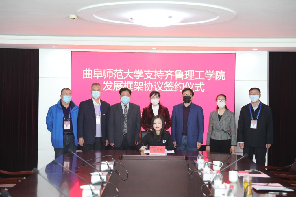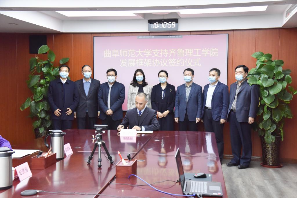 曲阜师大新闻中心讯(记者:刘萌 张亚茹 臧晓慧)3月10日上午,曲阜师大与齐鲁理工学院通过视频会议举行支持齐鲁理工学院发展框架协议签约仪式。D体育在线登录官网党委副书记、校长张洪海,党委常委、副校长李兆祥,党委常委、组织部部长郭庆兵,齐鲁理工学院董事长、校长常翠鸣,副校长、总督学魏希启,副校长于衍真、单成娟、张庚灵出席签约仪式。我校相关单位学院负责人参加了活动。签约仪式由齐鲁理工学院副校长张庚灵主持。