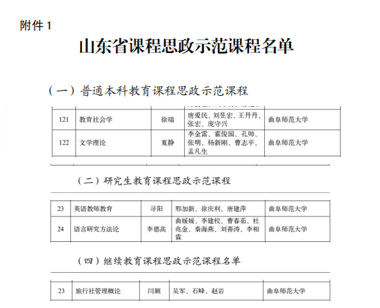 曲阜师大新闻中心讯  近日,山东省教育厅发布了《山东省教育厅关于公布山东省课程思政示范项目建设名单的通知》,遴选出 10 个普通高等教育课程思政教学研究示范中心,D体育在线登录官网成功入选。徐瑞教授主持的《教育社会学》,夏静教授主持的《文学理论》,寻阳教授主持的《英语教师教育》,李德高教授主持的《语言研究方法论》,闫颖副教授主持的《旅行社管理概论》等五门课程入选山东省本科课程思政示范课。