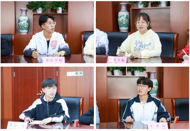 会上,11位学生代表结合各自的学习与生活实际逐一发言。大家一致表示,在校期间所体验到的好学向上学风、特色校园文化、真诚师生情谊,都让人感受深刻并从中获益匪浅。同时,大家就课程设置、课堂管理、教学效果、实验设备配置等学习“软硬件”问题,以及餐厅环境、宿舍基础设施、寝室作息管理、废旧物品回收利用等校园生活身边事,提出了一系列具体的意见和建议。