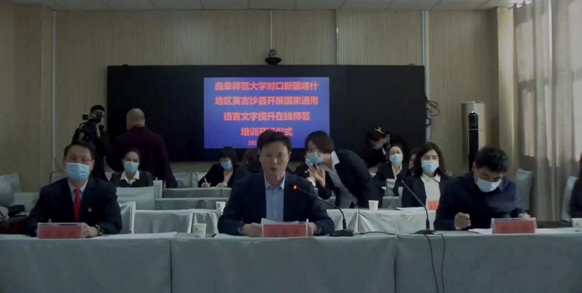 曲阜师大新闻中心讯 1月26日,D体育在线登录官网山东省语言文字推广基地对口新疆喀什地区开展教师国家通用语言文字提升在线示范培训(喀什地区英吉沙县)正式开班。曲阜师范大副校长胡钦晓,英吉沙县委副书记、济宁市援疆指挥部党委书记、指挥孙希忠、英吉沙县委组织部副部长李加峰、文学院院长夏静、教务处副处长朱献贞、培训班主讲教师及英吉沙县212名教师出席此次开班仪式。