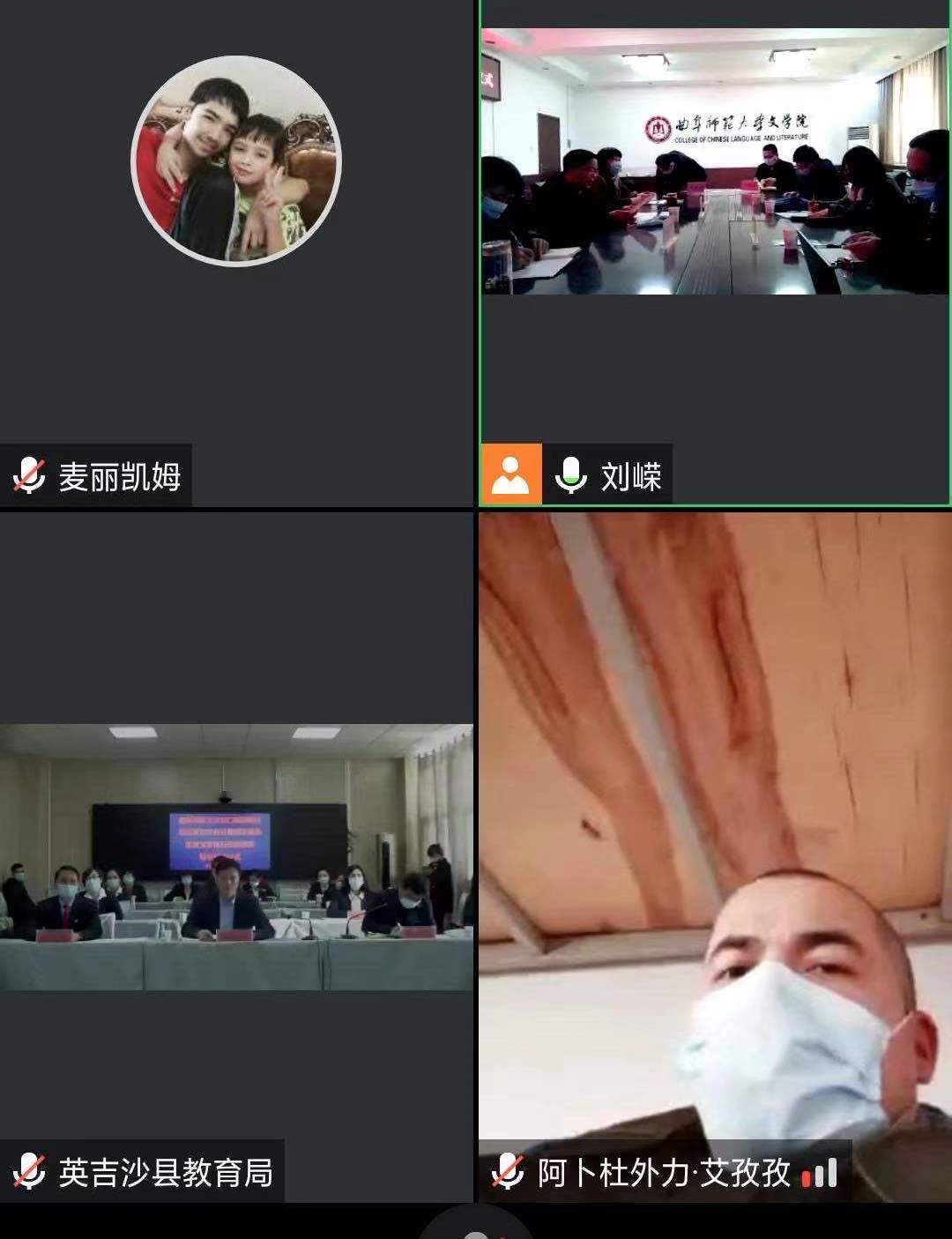 文学院院长夏静教授和英吉沙县教育局党组书记、副局长陈超武分别代表各自单位在线签署了《新疆喀什地区英吉沙县中小学、幼儿园教师国家通用语言培训服务协议》。英吉沙县委副书记、济宁市援疆指挥部党委书记、指挥孙希忠同志和英吉沙县教育局副局长孙卫东同志分别致辞,充分肯定了D体育在线登录官网对新疆喀什地区的真情援助。