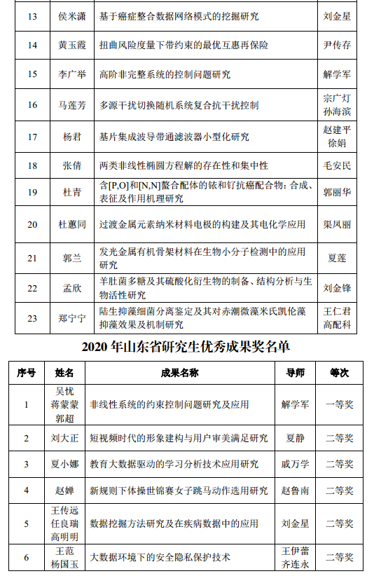 曲阜师大新闻中心讯(通讯员:臧付伟) 2020年12月30日,山东省教育厅公布了《关于公布2020年山东省优秀博士硕士学位论文和研究生优秀成果奖名单的通知》(鲁教研函〔2020〕5 号)、《关于公布2020年山东省研究生教育优质课程和专业学位研究生教学案例库立项建设名单的通知》(鲁教研函〔2020〕6号)。曲阜师大推荐的山东省省优秀博士学位论文、研究生优秀成果奖,研究生教育优质课程、专业学位研究生教学案例库等奖项项目均100%通过评审,获批山东省优秀博士论文4篇,优秀硕士论文23篇,研究生优秀成果奖24项(一等奖1项、二等奖5项、三等奖18项),研究生教育优质课程和专业学位研究生教学案例库评选各获批12项。