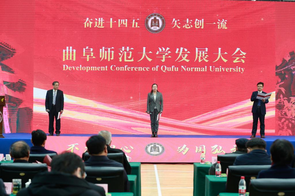 曲阜师大新闻中心讯 为决胜“十三五”收官、蓄势“十四五”开局,12月27日上午,曲阜师大隆重举行奋进“十四五”发展大会。“凝聚发展力量,共绘发展蓝图”、“迈向高水平大学建设新征程”、“书写复兴曲园荣光的时代新章”等标语条幅悬垂大会现场两侧,昭示着全校上下锐意进取、勇开新局的发展势能,鼓舞着曲师人乘势而上、再建新功的信念与力量。