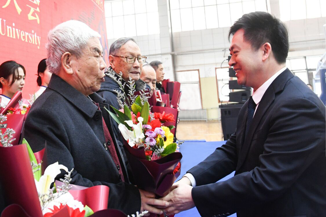 学校党委书记戚万学、校长张洪海为老教授、校友以及优秀教师代表颁发荣誉纪念