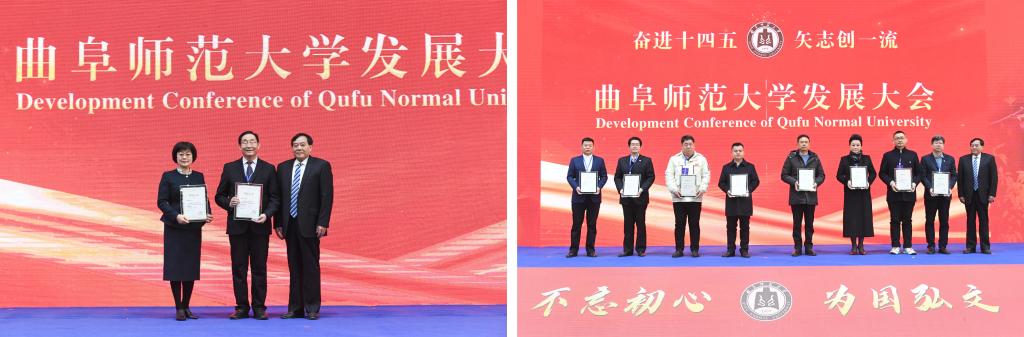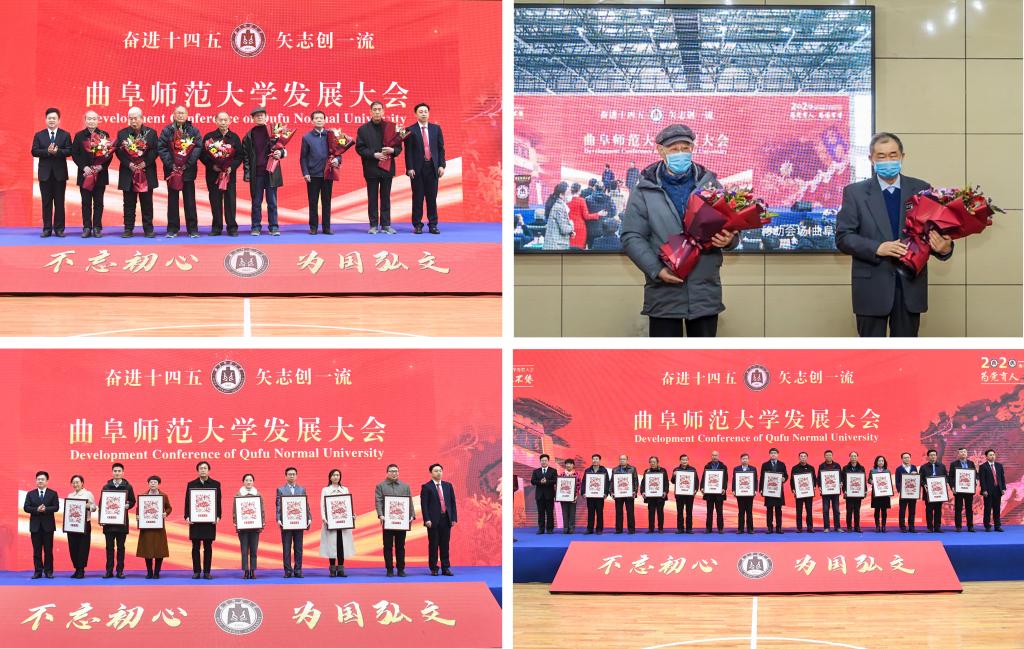 发展成就离不开一代代曲师人众志成城、夯基垒台,开创未来仍需弘扬光荣传统接续奋斗、汇聚多方力量开拓进取。大会专门邀请经济民、骆承烈、初学导、王品超、徐振贵、吴福全、张瑞甫、曹宝香、王友才等老教授,谷汉民、解授禄等老领导,以及校友和一线优秀教师代表,来到现场共襄盛举,并向他们为曲园事业作出的贡献致以崇高敬意。在现场热烈的掌声中,学校党委书记戚万学、校长张洪海为发展贡献者送上鲜花、颁发荣誉纪念。