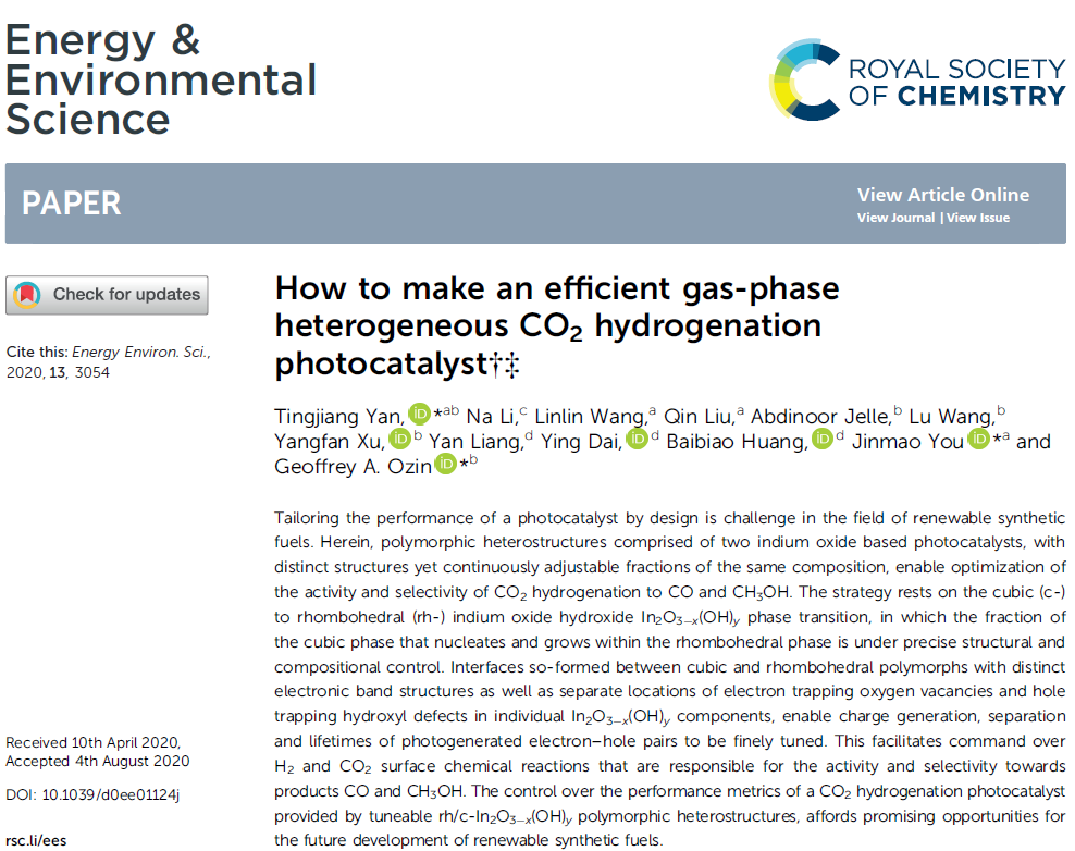 此外,2020年8月,颜廷江教授还基于立方相(cubic,c-)到菱形相(rhombohedral,rh-)氧化铟In2O3-x(OH)y的相变,通过调节rh/c-In2O3-x(OH)y多晶型异质结对CO2加氢光催化剂性能的指标,构建出了新型高效的缺陷异相结光催化剂,对未来可再生合成燃料的发展提供了良好的契机。相关工作发表以“How to Make an Efficient Gas-Phase Heterogeneous CO2 Hydrogenation Photocatalyst”为题发表在国际顶级期刊Energy & Environmental Science(影响因子30.289)。D体育在线登录官网为论文的第一署名单位和第一通讯署名单位。