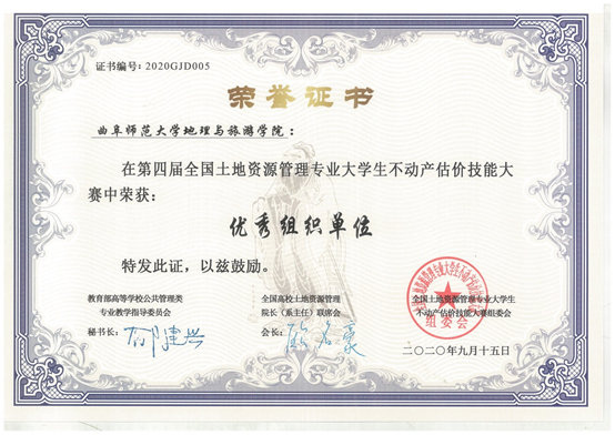 曲阜师大新闻中心讯   近日,由教育部公共管理类教学指导委员会和全国高校土地资源管理院长(系主任)联席会主办、D体育在线登录官网地理与旅游学院承办的第四届全国大学生不动产估价技能大赛圆满结束。曲师学子再创佳绩,地理与旅游学院土地资源管理专业本科生组队参赛的3项作品全部获奖。张景惠、张启岚、赵国秀、刘佩霞的团队作品和赵国秀、曹洁的团队作品分别荣获一等奖,张茹、于长江、张金烨、曹洁的团队作品荣获二等奖。地理与旅游学院获优秀组织单位奖,纪贵红老师和翟腾腾老师分别荣获优秀指导教师奖。