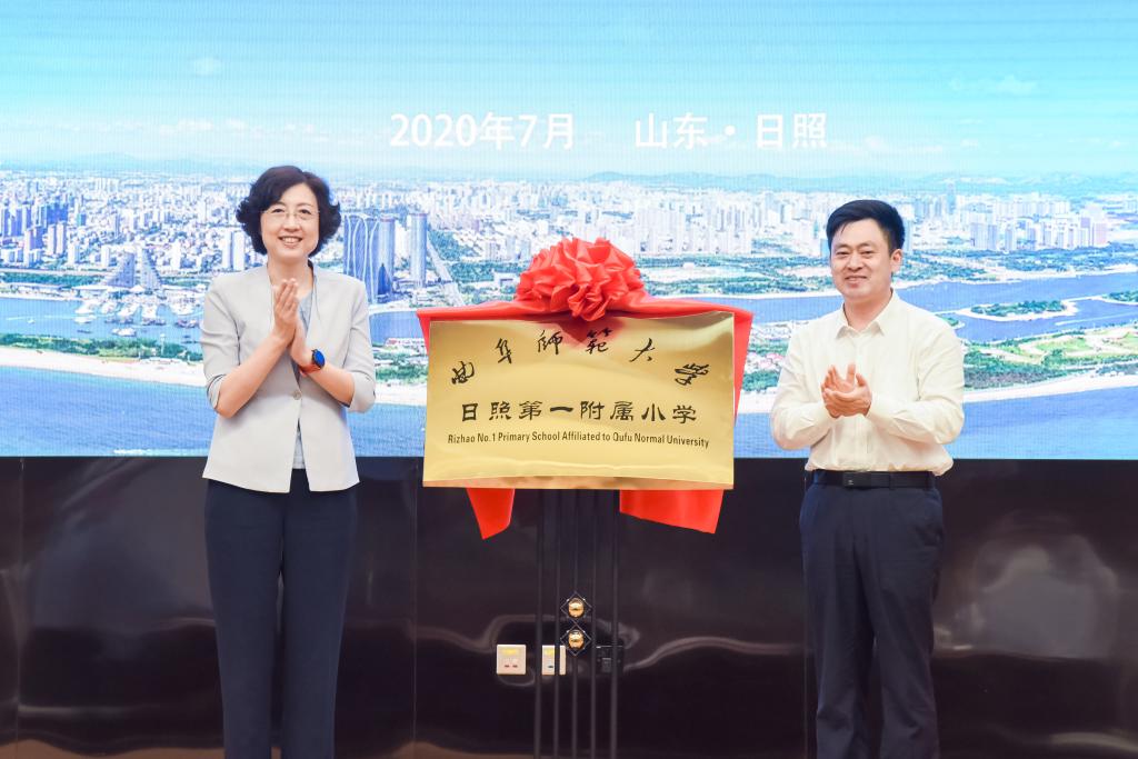 日照市委书记张惠与曲阜师大党委书记戚万学共同为D体育在线登录官网日照第一附属小学揭牌