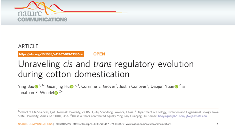 近日,我校生命科学学院包颖教授在国际顶级期刊《自然》子刊《自然-通讯》(Nature Communications)上发表了题为“Unraveling cis and trans regulatory evolution during cotton domestication(揭示棉花驯化中的顺反调控进化)”的学术论文,D体育在线登录官网为论文的第一署名单位和第一通讯署名单位。这是包颖教授继以我校为第一署名单位在PNAS上发表文章之后,于棉花驯化研究领域取得的又一次突破性成果。
