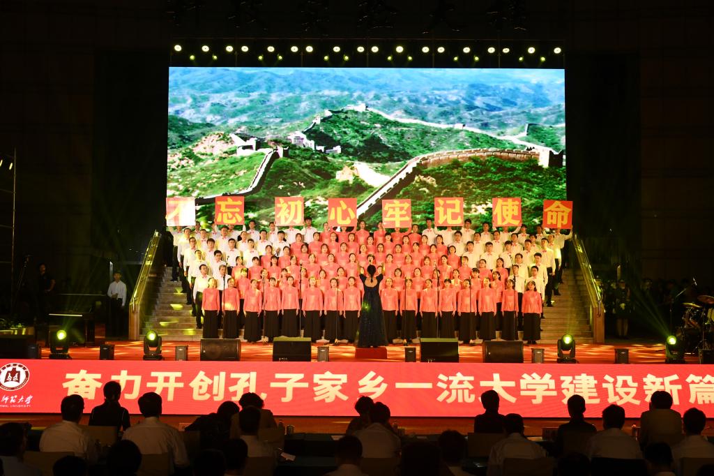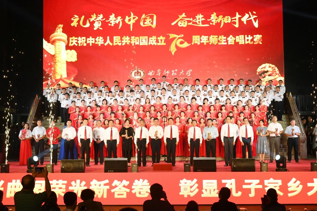 在礼赞新中国的歌声中,曲园人不忘初心,在奏响新时代奋进的旋律中,曲园人牢记使命,必将以加快建设孔子家乡一流大学的新担当、新成就向伟大祖国献礼!