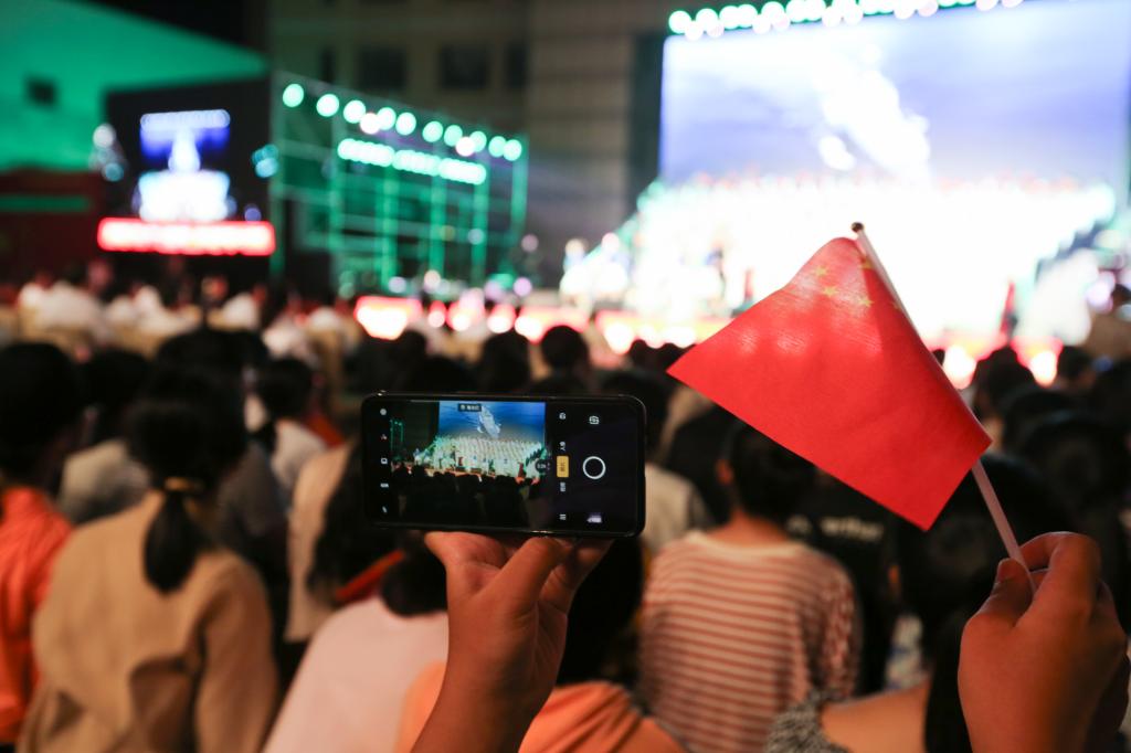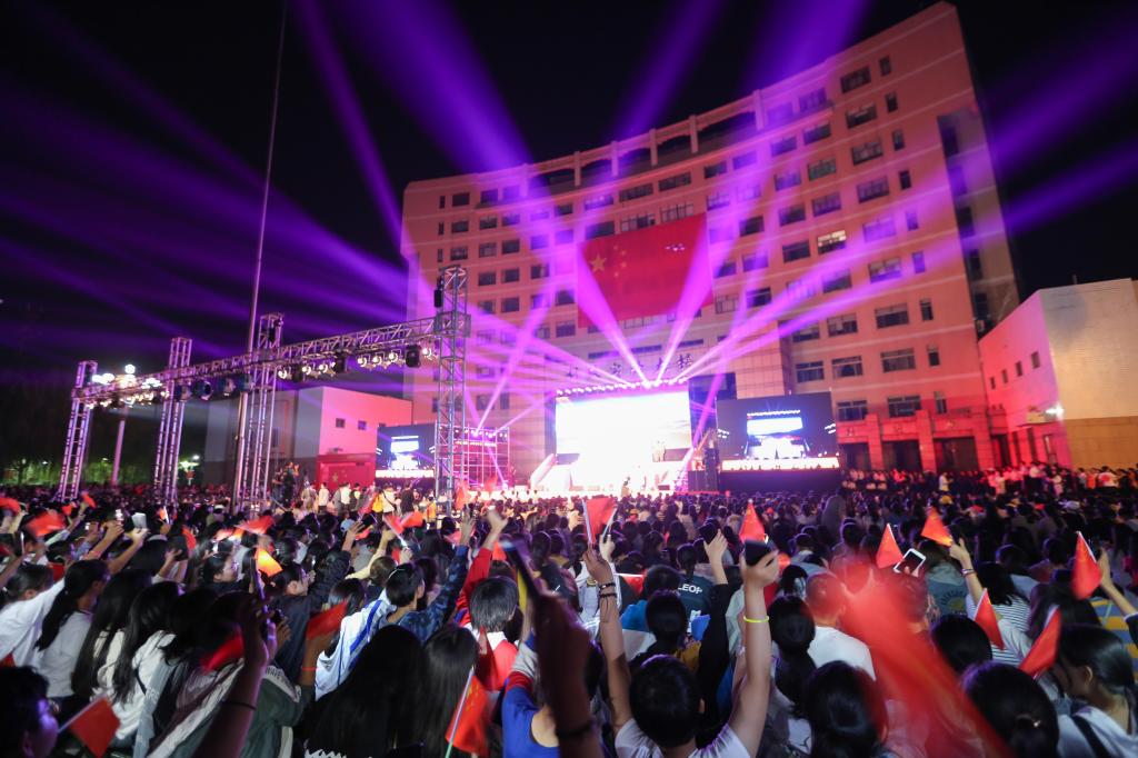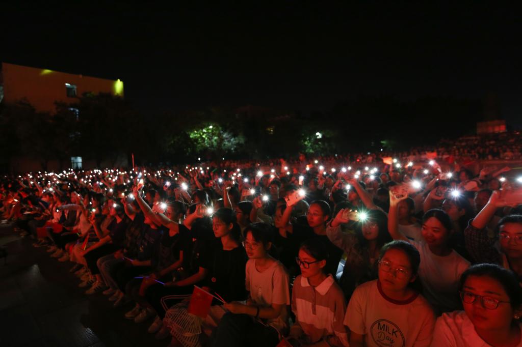 日照校区现场,彩灯交替,人潮澎湃,阳光会场一面五星红旗悬挂主席台正上方,鲜艳夺目的中国红与星月交相辉映,“不忘为国弘文初心”和“牢记立德树人使命”的条幅环绕两侧,观众席接近百米的长龙、几千人的队伍围绕广场的台阶顺次而坐,人人手持小国旗和荧光棒,不时传来为演出加油的阵阵欢呼。
