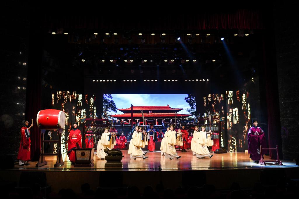 会讲结束后,与会领导、嘉宾以及师生代表,共同观看了由我校师生精心组织的师德教育成果汇报演出。演出现场,我校雅乐团为大家呈现了一场钟磬和鸣、羽衣蹁跹的传统儒家礼乐盛宴;我校学子合唱《飞来的花瓣》,在婉转悠扬的旋律中为教书育人的老师们献上了真挚的祝福;舞蹈《桃李不言》以优美灵动的舞姿体现了感怀师恩的真情,彰显着对尊师风尚的弘扬;曲园师生原创话剧《夫子》生动再现了孔子与弟子们的教学场景,以强烈的历史厚重感和现场感染力,使孔子的伟大教育思想直抵观众心间,将演出气氛推向高潮。整场演出充分展现了曲园人的深厚文化底蕴和鲜明时代风采,赢得了阵阵掌声与一致好评。