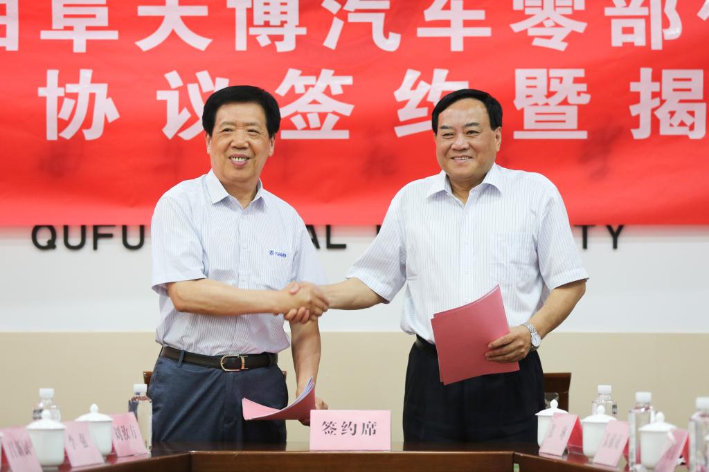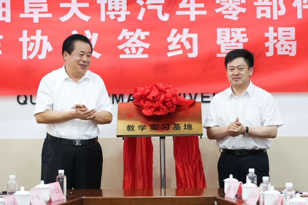 6月27日下午,我校与山东东宏管业股份有限公司、曲阜天博汽车零部件制造有限公司隆重举行校企合作协议签约暨揭牌仪式。山东省委政策研究室副主任、省派民营企业服务队济宁二队队长王淼,学校党委书记戚万学,曲阜市委书记刘东波,出席仪式并致辞。戚万学先后与曲阜天博汽车零部件制造有限公司董事长吕新民、山东东宏管业股份有限公司董事长倪立营,为D体育在线登录官网教学实习基地共同揭牌。学校副校长冯冲代表学校先后与倪立营、吕新民签署校企合作协议。