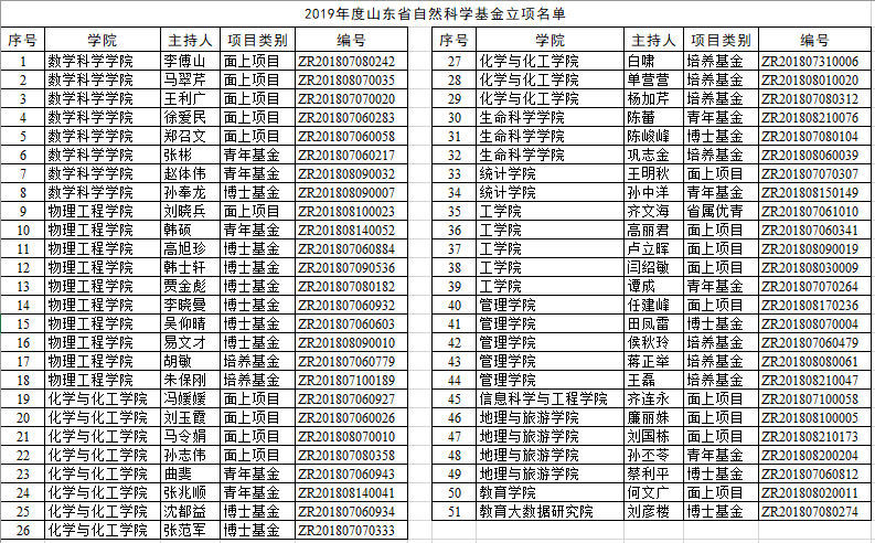 在获批的51项山东省自然科学基金项目中,数学科学学院8,物理工程学院10项,化学与化工学院11项,生命科学学院3项,统计学院2项,工学院5项,管理学院5项,信息科学与工程学院1项,地理与旅游学院4项,教育学院1项,教育大数据研究院1项。
