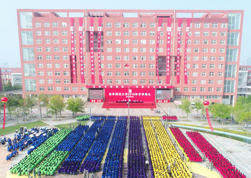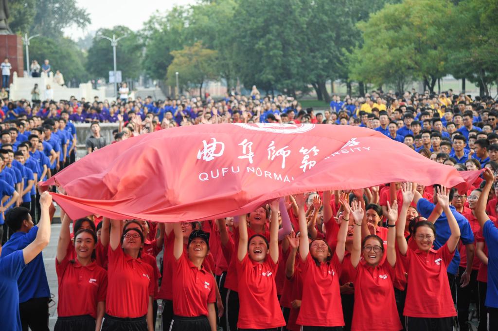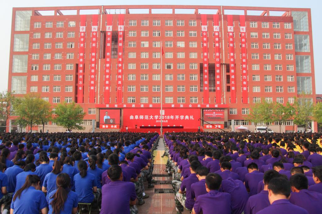典礼在庄严的国歌声中拉开帷幕,现场隆重而热烈。由2018级新同学组成的缤纷方阵举目望去,“为国弘文”四个大字鲜艳夺目,彰显着曲园人的文化自觉与文化自信;典礼主席台两侧,“犹有洙泗遗韵,更加众志成城”——63年前首次开学典礼上的“创校宣言”,以历史的神圣与厚重,昭示着曲园人奋进新时代、建设孔子家乡一流大学的决心与担当。