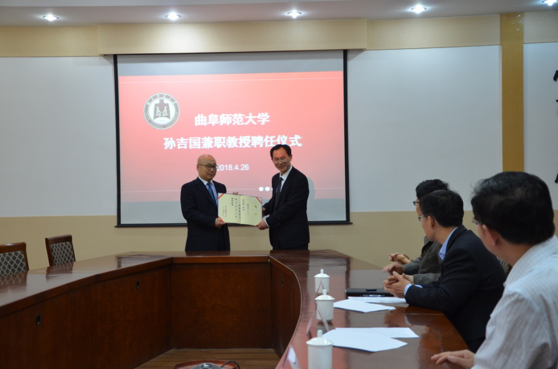 4月26日下午,山东省区域文化产业研究院院长、山东省高端智库人才入库专家孙吉国研究员被聘为我校兼职教授。副校长辛杰出席活动并向孙吉国颁发兼职教授聘书国内合作处、历史文化学院人事处负责人等参加了活动