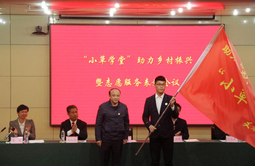 会议现场举行了爱心企业向“小草学堂”捐赠及“小草学堂”流动图书馆揭牌仪式。团省委副书记李子元向我校“助力乡村振兴‘小草学堂’支教团”授旗。