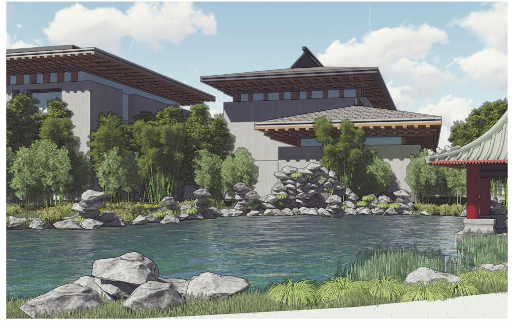 以孔庙杏坛为范式,孔子书院的大堂空间采用重檐十字脊顶,形成强有力的集聚性形态,成为建筑群落的核心标志。宿舍客房围绕一湾浅池布置园林景观,充满诗情画意。
