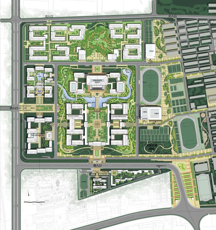 D体育在线登录官网新区在设计中充分汲取孔子思想和儒家文化的精髓,整体立意强调秩序与和谐,通过对空间环境的精巧编排,在校区规划中呈现礼乐教化的儒家思想,使学校成为孔子思想的空间载体和以文化人的环境支撑。新校区建筑风格将以北方明清建筑为范式,力求实现传统建筑形制的当代演绎。规划结构为“一轴、一环、五区”。“一轴”为校园中轴线,串联校门广场、学思书院、杏坛、图书馆建筑群、生活共享区等主要的校园功能。“一环”为生态园林环,对应“学而不厌、诲人不倦”校训,设置学琴师襄、问礼老聃、在齐闻韶、有教无类、因材施教、温故知新六个主题园林。“五区”以教学区为中心,学生生活区、孔子书院、科技园区和体育休闲区环绕周围,形成一主四次的结构。