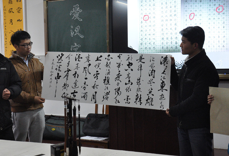 “青青子衿,悠悠我心”的吟唱中,班会正式开始。班长王晓晖就班级围绕“中文专业师范生基本功培养”,开展钢笔字、粉笔字、毛笔字和普通话训练活动作了简要介绍。同学们现场与大家分享了练字心得,进行硬笔、软笔书法展示。在普通话汇报环节,同学们共同吟诵一首英文诗歌的几种汉语翻译版,更具体、深入地展示了汉语之美。