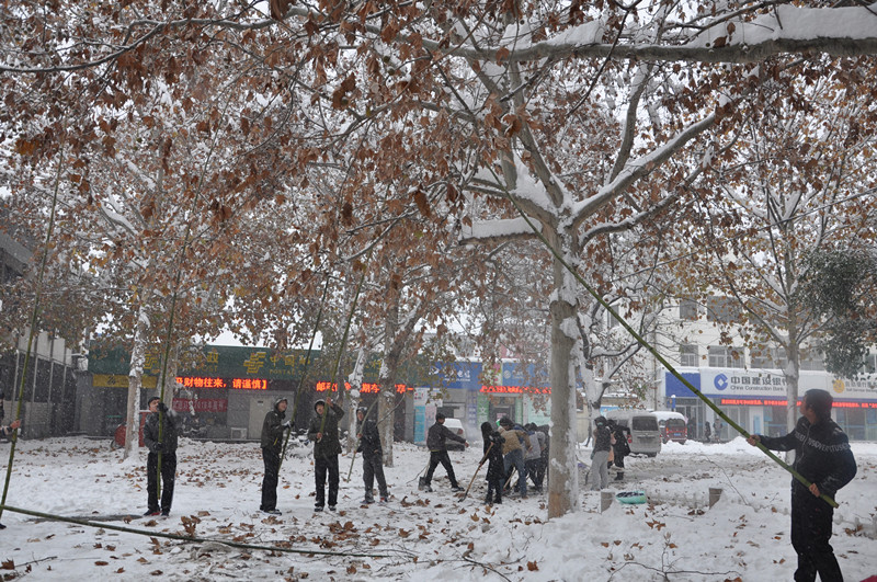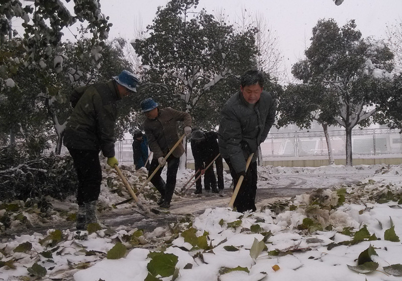 25日下午,全校师生纷纷行动起来,大家走出教室和办公室,来到校园各处,或用铁锹铲除路面积雪,保障道路通畅;或用竹竿敲打树木积雪,为不堪重负的名贵树木减负。