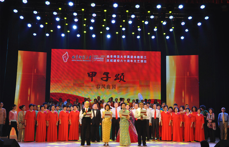 在演出过程中,党委书记荆兆勋、校长戚万学为在学校工作和生活50年以上的获得省级以上荣誉称号的离退休教职工代表颁发荣誉牌并合影留念,对他们为母校所作出的贡献表示感谢,并祝愿广大校友在工作岗位上继续发扬曲阜师大精神,努力工作、踏实进取为祖国为社会作出应有的贡献,继续为母校赢得荣誉。