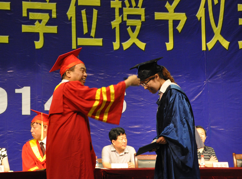 伴随着欢乐的乐曲,16位博士学位获得者、1189位全日制硕士学位获得者走上主席台,校长傅永聚逐一为他们颁发学位证书,并拨苏正冠,合影留念。