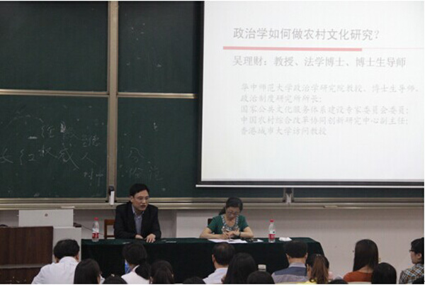 6月3日晚,华中师范大学政治学研究院教授、博士生导师吴理财教授作了题为“政治学如何做农村文化研究”的学术报告。吴教授讲解了文化的概念,认为文化是一个公共性概念。目前农村文化建设出现农村中公共空间越来越少,文化的公共性已接近瓦解的问题。吴教授认为,农村文化也可以成为政治学研究的一个视角,政治学可以从领导机制、城乡发展角度对农村文化进行研究。吴教授结合自己的读书经历,对同学们提出了多读书、读经典著作的要求,并与同学们就政治学与农村文化研究展开了热烈的探讨。