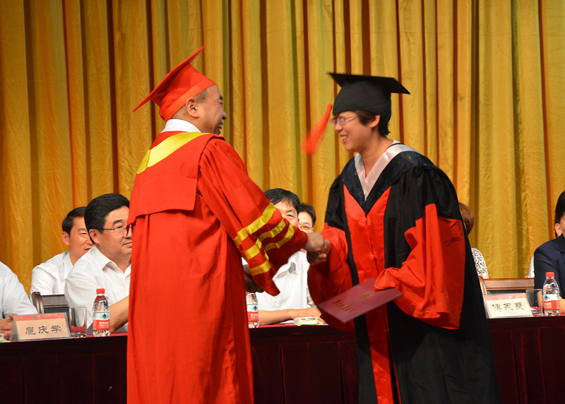 在优美的乐曲声中,校长傅永聚为2013届毕业生代表颁发毕业证书、学位证书,拨正流苏。