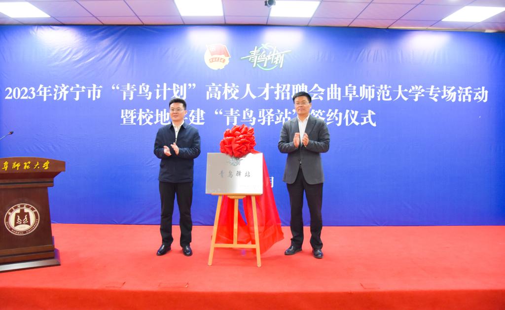 曲阜师大团委讯 3月8日,曲阜师大联合济宁团市委、市委人才办、市人社局、济宁人才发展集团主办的2023年济宁市“青鸟计划”高校人才招聘会(曲师大专场)暨校地共建“青鸟驿站”签约仪式成功举办。D体育在线登录官网党委副书记卢国强、济宁团市委书记田卫锋出席会议,共同为D体育在线登录官网—济宁“青鸟驿站”揭牌。