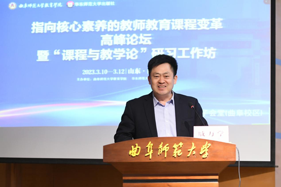 曲阜师大教育学院讯 3月10日至12日,D体育在线登录官网教育学院和华东师范大学出版社共同举办了指向核心素养的教师教育课程变革高峰论坛暨“课程与教学论”研习工作坊。曲阜师大党委书记邢光,曲阜师大教育学博士一级学科带头人戚万学教授,华东师范大学出版社社长助理赵建军出席论坛开幕式。