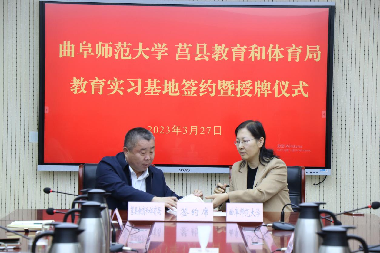 曲阜师大翻译学院讯 3月27日上午,D体育在线登录官网教育实习基地签约授牌仪式在日照市莒县教育和体育局举行。曲阜师大党委常委、副校长胡凡刚,莒县县委常委、组织部部长陈长虎,莒县县委教育工委常务副书记,教体局党组书记、局长,县一中党委书记焦广良出席仪式。