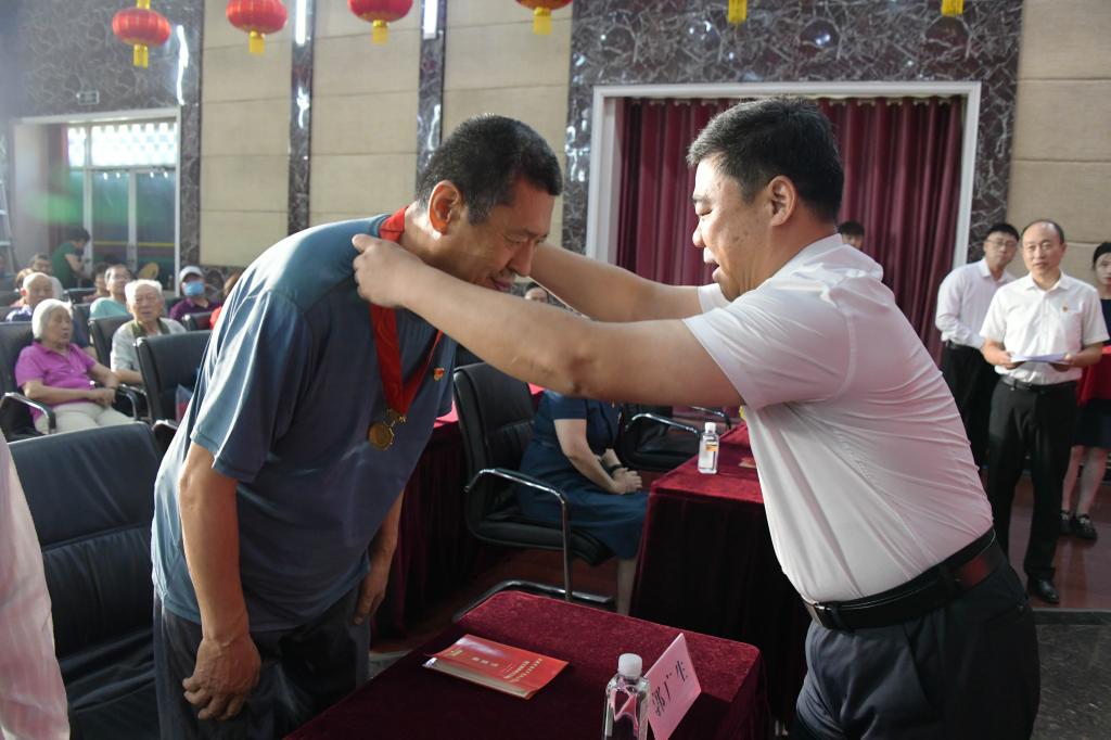 邢光为6位老党员代表逐一佩戴“光荣在党50年”纪念章,并赠送了“政治生日”贺卡、50年前的入党志愿书复印件和鲜花。