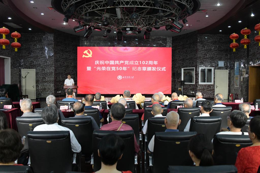 离退休教职工党委讯 在中国共产党成立102周年之际,学校于6月30日下午隆重举行庆祝中国共产党成立102周年暨“光荣在党50年”纪念章颁发仪式。学校党委书记邢光、党委副书记李志红出席活动,党委常委、组织部部长王明科主持仪式。“光荣在党50年”纪念章获得者、离退休党员代表和离退休工作人员等参加活动。