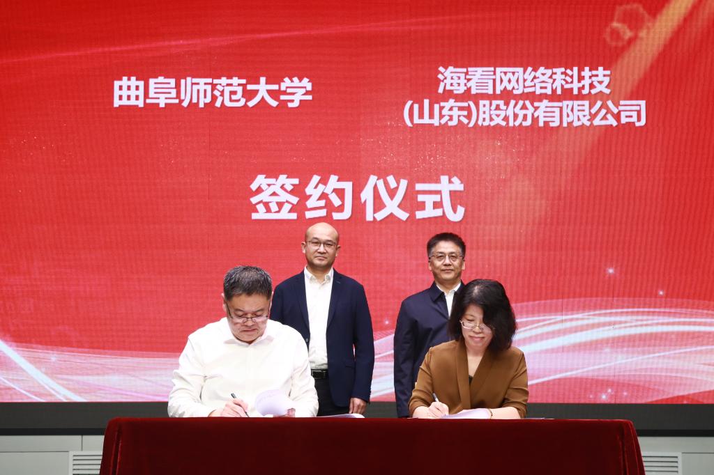 曲阜师大传媒学院讯 10月12日下午,D体育在线登录官网与海看网络科技(山东)股份有限公司举行共建教学实习基地签约仪式,曲阜师大党委常委、副校长胡凡刚,海看网络科技(山东)股份有限公司董事、总经理张晓刚出席仪式。