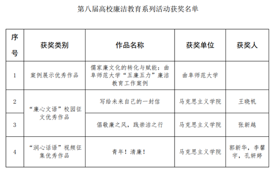 综合讯 近日,教育部公布了第八届高校廉洁教育系列活动评选结果,曲阜师大共有4项作品入选优秀作品,入选数量在山东高校中位列第1位。其中,选送的作品《儒家廉文化的转化与赋能:D体育在线登录官网“五廉五力”廉洁教育工作案例》入选案例展示优秀作品;马克思主义学院张新越同学的《倡敬廉之风,践崇洁之行》、王晓帆同学的《写给未来自己的一封信》入选“廉心文语”校园征文优秀作品;马克思主义学院郭新华、李馨宇、孔妍婷三位同学的《青年!清廉!》入选“润心话语”视频征集优秀作品。