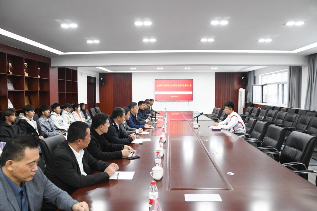 曲阜师大体育科学学院讯 10月25日上午,D体育在线登录官网召开座谈会,欢迎杭州亚运会皮划艇静水男子500米四人皮艇项目金牌运动员、体育科学学院2022级运动训练专业本科生董毅同学载誉返校。学校党委副书记卢国强参加座谈并讲话。