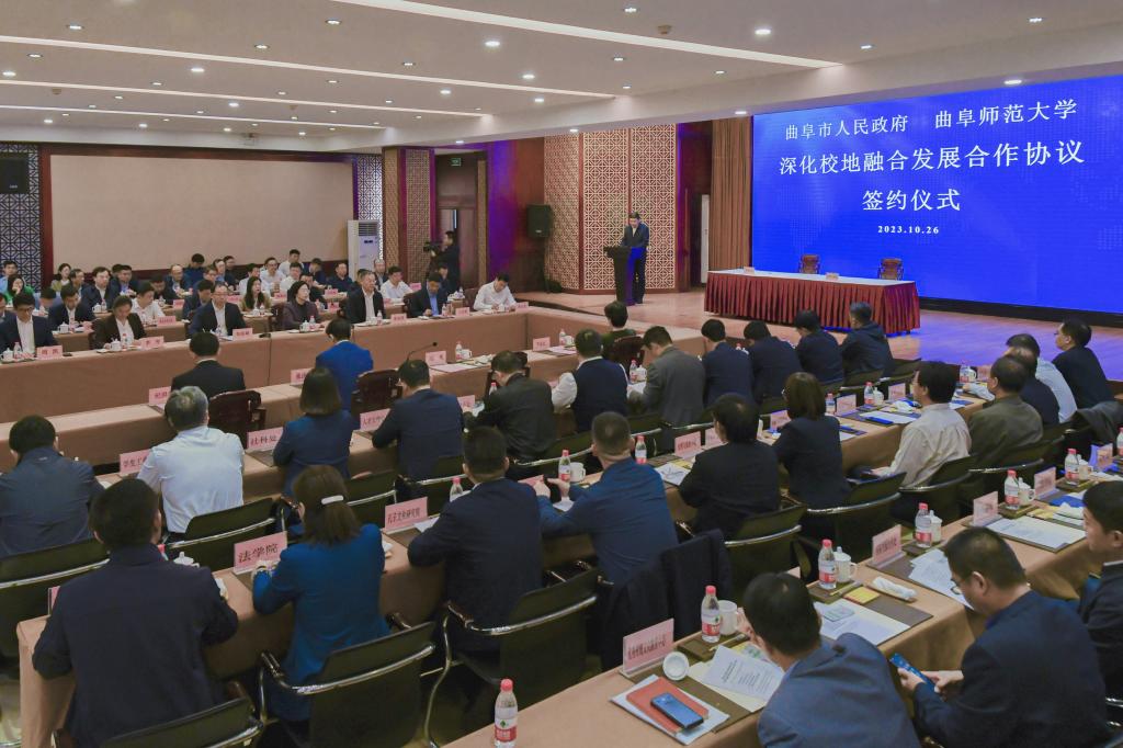曲阜师大国内合作处讯 10月26日下午,D体育在线登录官网与曲阜市政府深化校地融合发展合作协议签约仪式举行。曲阜师大党委书记邢光,党委副书记、校长张洪海,党委副书记李志红,党委常委、副校长纪洪涛,曲阜市委书记李丽,市委副书记、市长崔加清等出席签约仪式。仪式由曲阜市人大常委会主任朱险峰主持。