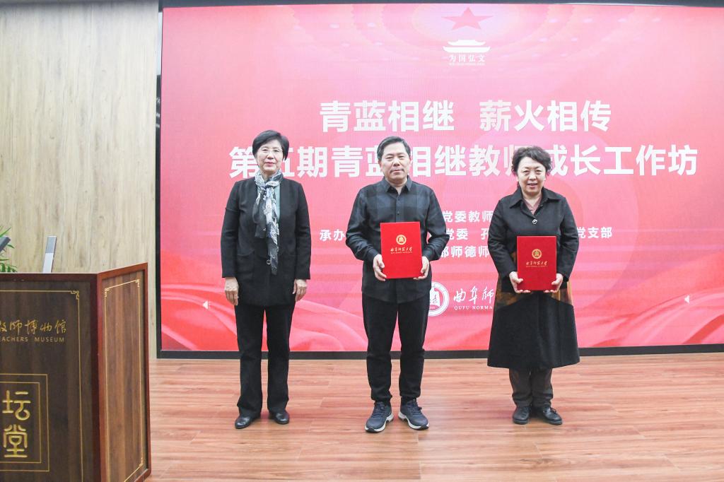 历史文化学院王昌沛教授、孔子文化研究院刘彬教授受聘第五批“青年教师成长导师”,党委副书记李志红为两位成长导师颁发证书。