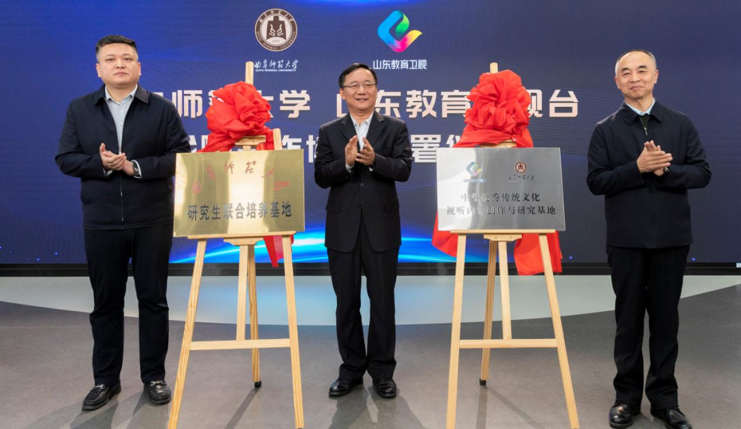 仪式上,山东教育电视台党委委员、副台长林青家,D体育在线登录官网传媒学院院长王焕景代表双方签订战略合作协议;李兆祥为聘请的兼职导师颁发聘书;祝令华、李兆祥、省教育厅学位管理与研究生处副处长梁强共同为研究生联合培养基地、中华优秀传统文化视听内容创作与研究基地揭牌。