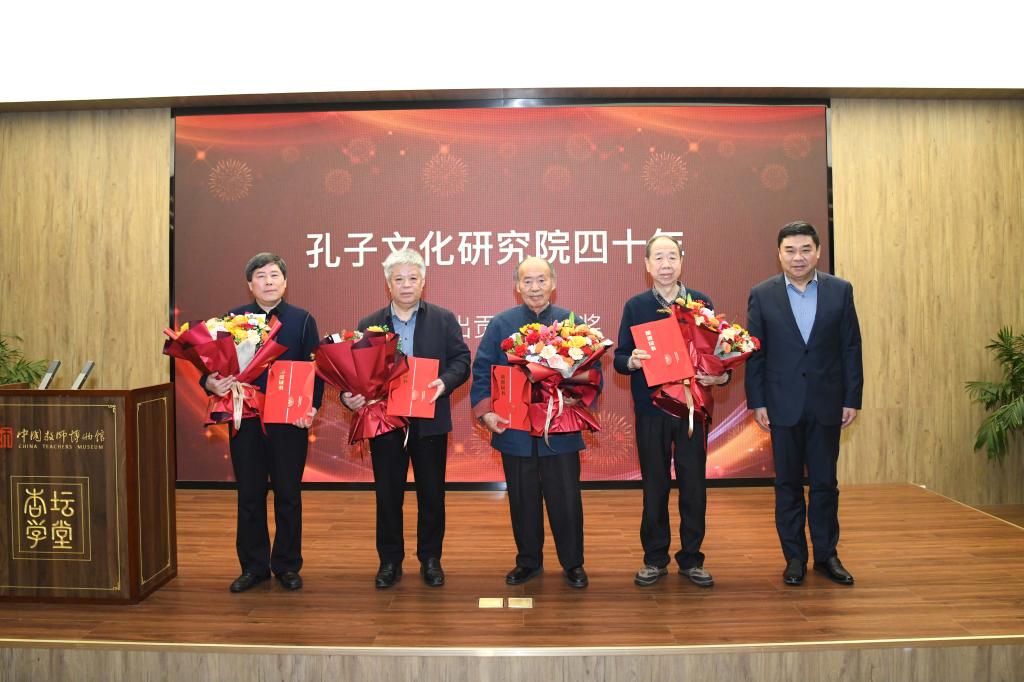 开幕式上,举行了突出贡献奖颁奖典礼。骆承烈、黄怀信、傅永聚、杨朝明、成积春、刘彬等七位先生为孔子文化研究院四十年学术研究和学科建设做出突出贡献受到表彰,邢光为突出贡献奖获得者颁发了获奖证书,孔子文化研究院青年教师向获奖者献花致敬。