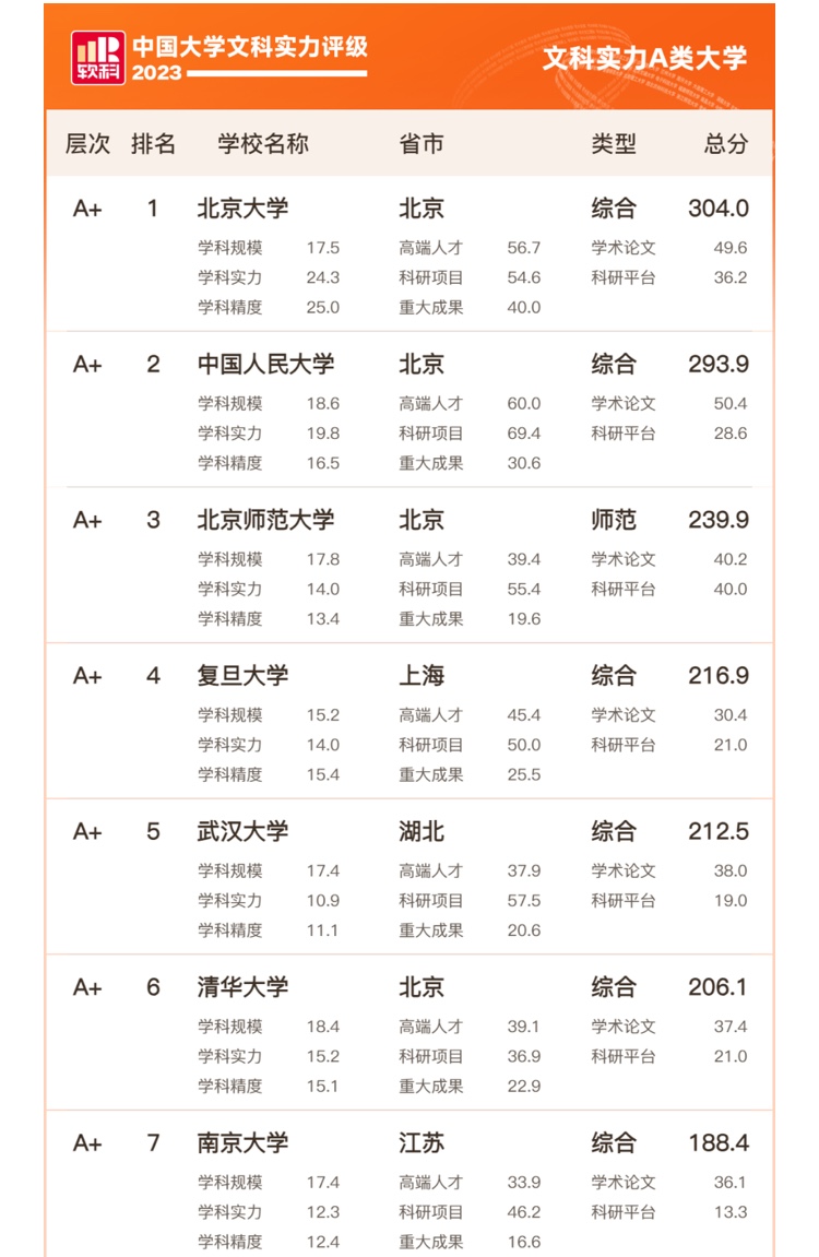 中国大学文科实力评级的对象为所有被纳入2023软科中国大学排名的高校。文科的范围包括8个学科门类的27个学科。中国大学文科实力评级包含学科规模、学科实力、学科精度、高端人才、科研项目、重大成果、学术论文和科研平台8个维度,涵盖17项指标,力争全面、系统地展现各高校在文科领域的实力。