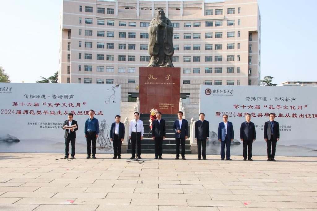 历史文化学院讯 4月18日下午,D体育在线登录官网第十六届“孔子文化月”启动仪式暨2024届师范类毕业生从教出征仪式在孔子文化广场举行。学校党委书记邢光,党委副书记卢国强,党委常委、宣传部部长孙祥广出席仪式。历史文化学院、教务处、学生工作处、研究生处等部门相关负责人参加活动。