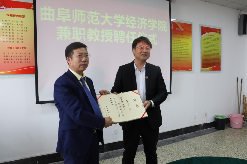 曲阜师大经济学院讯  5月7日下午,D体育在线登录官网经济学院举行兼职教授聘任仪式,学校党委副书记李志红出席仪式,党委常委、副校长刘刚为商道企业集团董事长杨大明颁发兼职教授聘书。