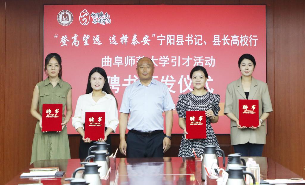 李洪涛为学生工作处就业指导中心主任石璐、生命科学学院辅导员袁晓涵、文学院辅导员高原、2021级化学与化工学院宁阳籍学生谢妍颁发宁阳县“校园招才引智大使”聘书。