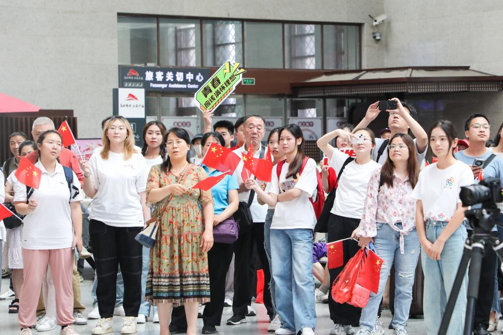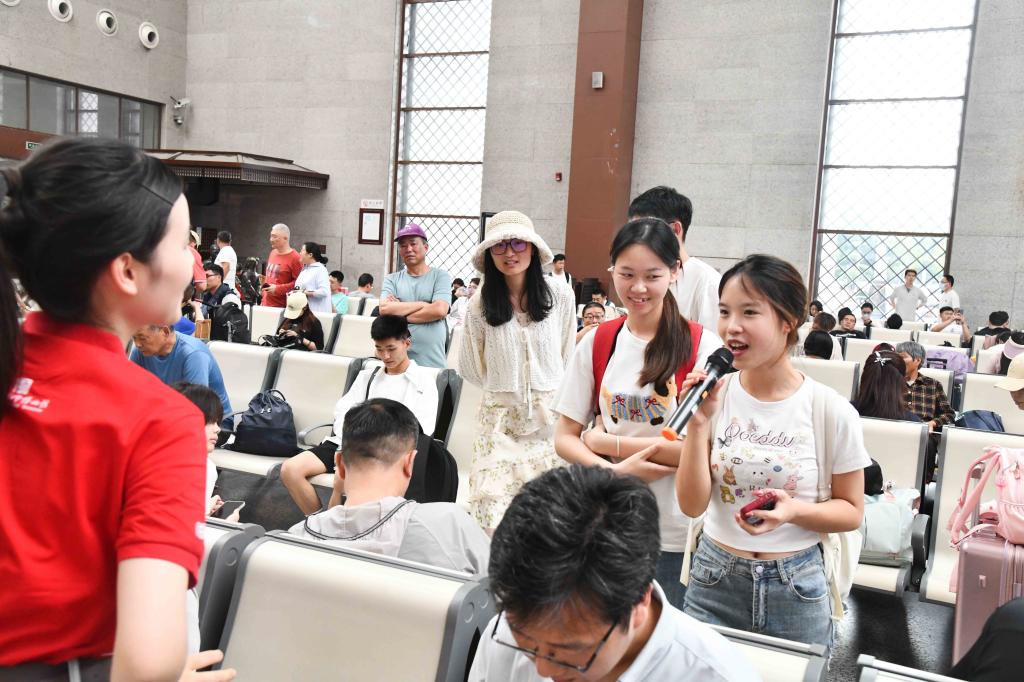 在候车大厅,学生及党员们伴随着歌声从四面八方汇成队伍,共同演奏《我和我的祖国》,吸引了很多旅客参与其中,他们手里挥动着国旗,与学生们一同欢唱,用激情澎湃的歌声,向祖国母亲致以最诚挚的祝福。歌曲结束后,现场旅客高声呼唤“祖国,我爱你”。